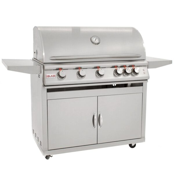 Blaze introduces an affordable commercial style grill that was designed with your outdoor BBQ challenges in mind. This Blaze 32-inch freestanding gas grill comes with four (4) commercial quality 304 cast stainless steel burners that each deliver an impressive 14,000 BTUs of cooking power, for a total of 56,000 BTUs on the cooking surface. The 10,000 BTU infrared rear burner works great with the optional rotisserie kit for grilling versatility. Durable 8mm stainless steel cooking rods maximize your searing capability on the spacious 748 square inches of cooking space. Push and turn flame-thrower primary ignition, backup flash tube secondary ignition and cross-tubes ensure a steady, reliable flame with every start. The removable warming rack is an ideal place to keep bread and other food heated while you grill. The stainless steel heat zone separators allow for different cooking zones across the grilling surface. This adds to your grilling experience, creating separate zones that can be used for different styles of cooking. The flame stabilizing grid minimizes flare-ups while you enjoy your Blaze grill and the full-width drip tray makes clean up a breeze. The stainless steel grill cart features two front doors for storing your tank, grill cover and BBQ accessories. The cart also includes four heavy duty caster wheels, allowing you to relocate the grill easily whenever necessary, and two side shelves for a convenient work area. The 304 stainless steel grill hood is double-lined to protect the outer layer from heat discoloration, keeping your Blaze grill looking shiny and new! This product is ETL certified with an ANSI Z21.58-2018/CSA 1.6 rating.