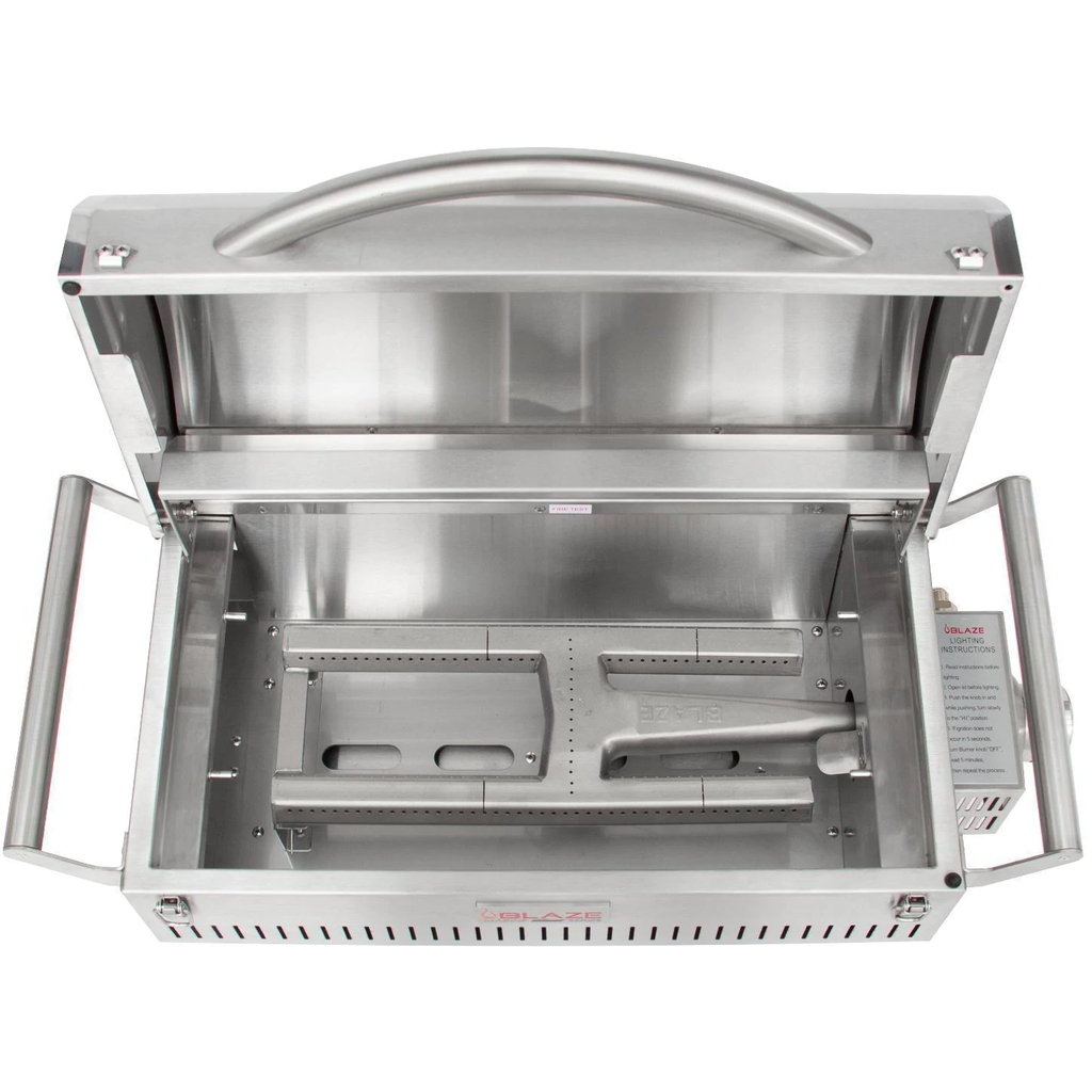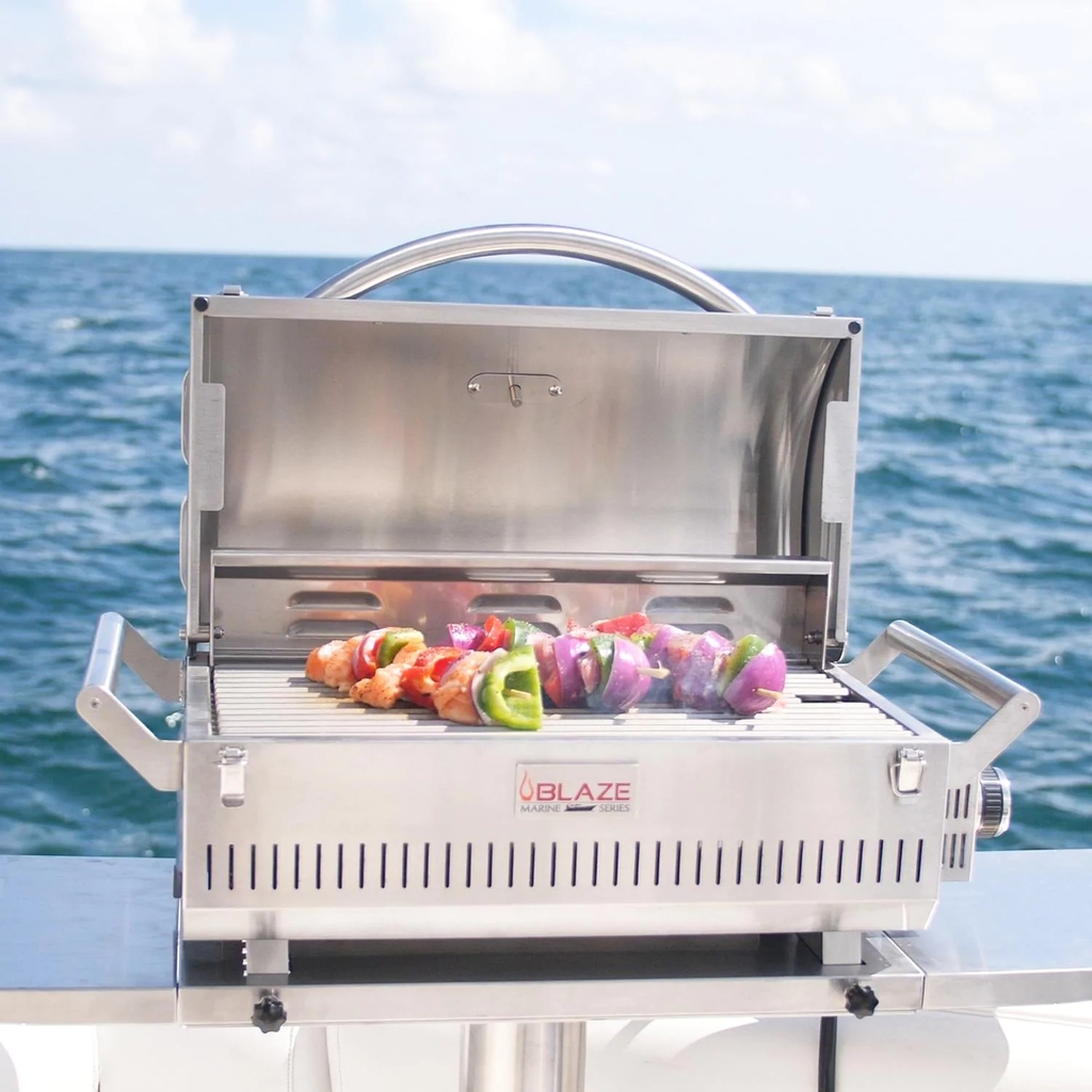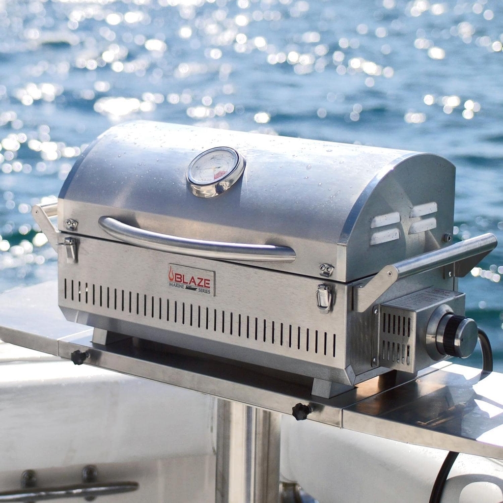 The Blaze Professional Marine Grade Portable Grill allows people to bring the power and quality of Blaze Grills offshore. The Professional Portable Grill utilizes all of the same commercial-grade components of the Blaze Professional Series built-in grills. This portable powerhouse has a marine grade, 316L stainless steel exterior and uses a 12,000 BTU cast stainless steel H-burner and 12-gauge stainless steel flame tamer to reach incredibly even heat. The heavy-duty 12mm hexagon, stainless steel cooking rods helps you achieve extraordinary searing temperatures, maximizes the durability of this grill and provides 201 square inches of grilling area. The push and turn flame-thrower primary ignition ensures a steady, reliable flame with every start. For when the grill is not in use, the lid can be locked shut with two front-facing clasps. This grill is designed to use a 1 Lb propane cylinder or a 20 Lb tank with the included tank adapter. This product is ETL certified with an ANSI Z21.58-2018/CSA 1.6 rating.