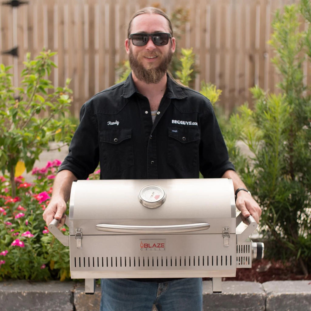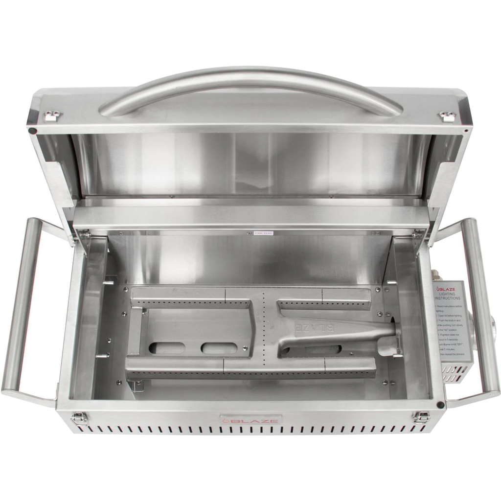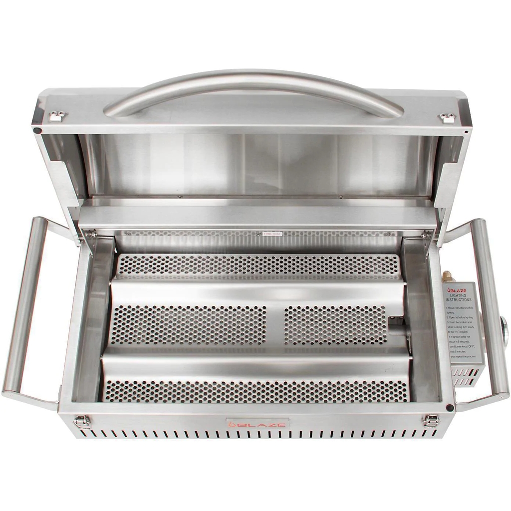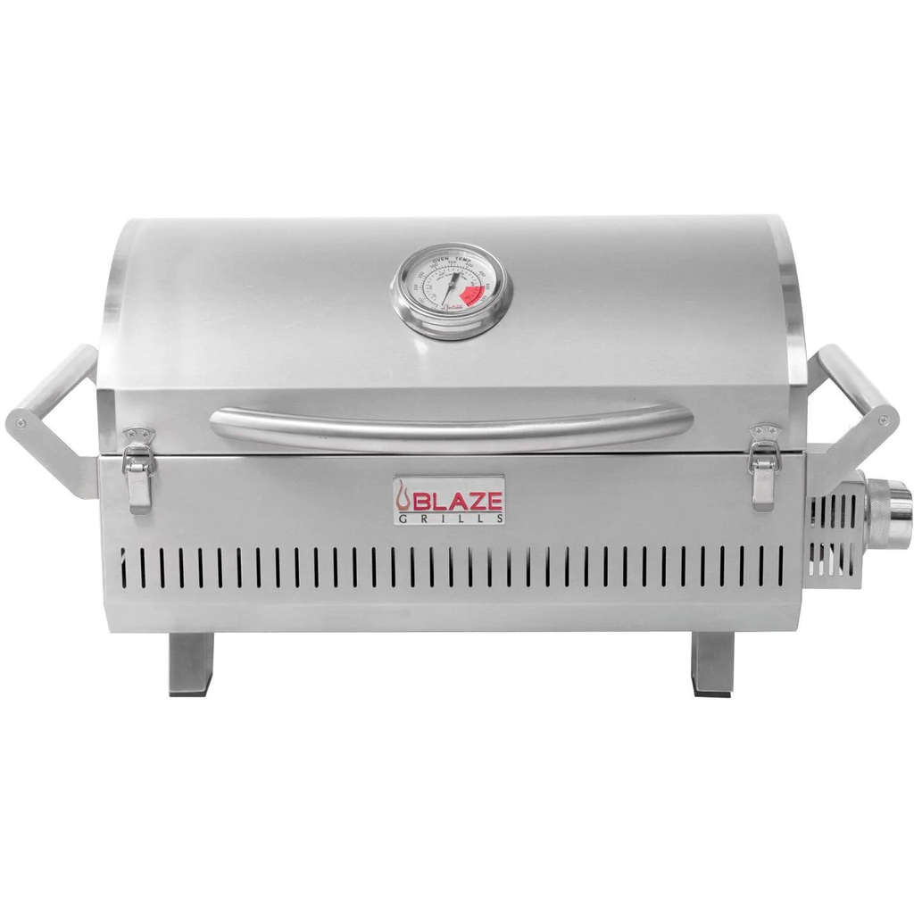 The Blaze Professional Portable Grill allows people to bring the power and quality of Blaze Grills on the road. The Professional Portable Grill utilizes all of the same commercial-grade components of the Blaze Professional Series built-in grills. This portable powerhouse has an all 304 stainless steel construction and uses a 12,000 BTU cast stainless steel H-burner and 12-gauge stainless steel flame tamer to reach incredibly even heat. The heavy-duty 12mm hexagon, stainless steel cooking rods helps you achieve extraordinary searing temperatures, maximizes the durability of this grill and provides 201 square inches of grilling area. The push and turn flame-thrower primary ignition ensures a steady, reliable flame with every start. For when the grill is not in use, the lid can be locked shut with two front-facing clasps. This grill is designed to use a 1 Lb propane cylinder or a 20 Lb tank with the included tank adapter. This product is ETL certified with an ANSI Z21.58-2018/CSA 1.6 rating.