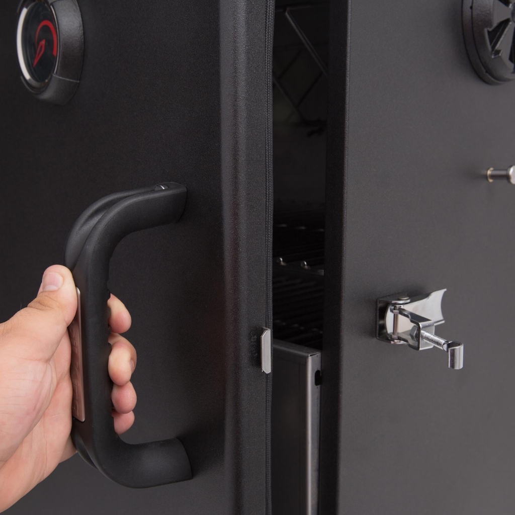 The Broil King Smoke vertical propane gas smoker features 770 square inches total cooking space, four adjustable stainless steel cooking grids, Sure-Lite electronic ignition system, adjustable Roto-Draft cast aluminum damper system, and two rugged steel doors with gasket premium latch system.