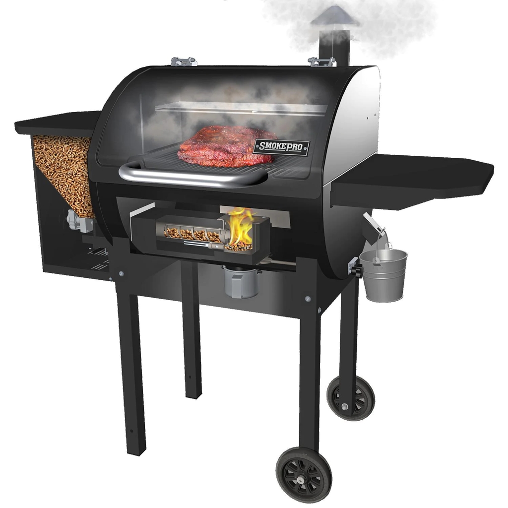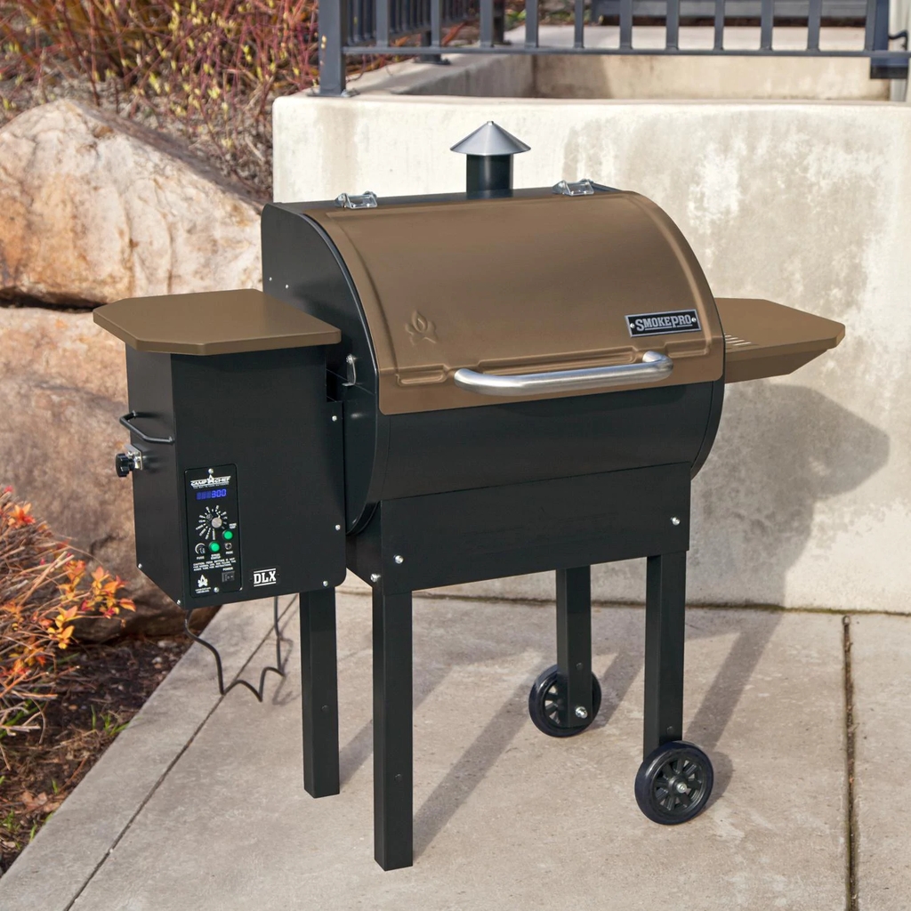 Take on your next grilling or smoking session with ease with the Camp Chef SmokePro DLX Pellet Grill. With the digital temperature display, simple temperature settings, and an exclusive ash clean out system, this grill will have you spending less time needing to monitor your grill and more time enjoying the outdoors and a delicious meal. This SmokePro DLX is constructed of durable powder coated steel with a bronze finished lid and a stainless steel fire box, and it features a 429 square inch primary cooking area and a 141 square inch upper warming rack. This gives you a total of 570 square inches of cooking space, all heated by 25,000 BTUs of cooking power. With the simple temperature selection system, the grill can be set to temperatures as low as 160 degrees for smoking and up to 500 degrees for the perfect sear. Once you have chosen your desired temperature, the digital display can be toggled between showing the grill temperature and internal food temperature, which is monitored by the included stainless steel meat probe. Smart Smoke technology keeps your Camp Chef pellet grill with 15 degrees of your selected temperature. The automatic auger dispenses pellets as needed from the high capacity hopper, which holds up to 18 pounds of pellets at once. A continuous fan insures that your grill stays evenly heated and smoky, so every bit of food is perfectly cooked. When you are done cooking, clean up is easy, thanks to the exclusive Camp Chef ash clean out system. Simply pull open the trap door with the side knob and empty the ash cup underneath the grill. This grill also features a pair of large, heavy-duty wheels for easy rolling, a pellet clean out door so you can keep your unused pellets protected and dry between uses, and a powder coated steel side shelf.