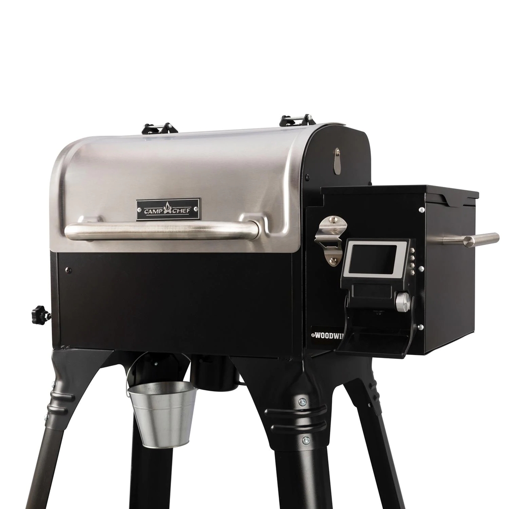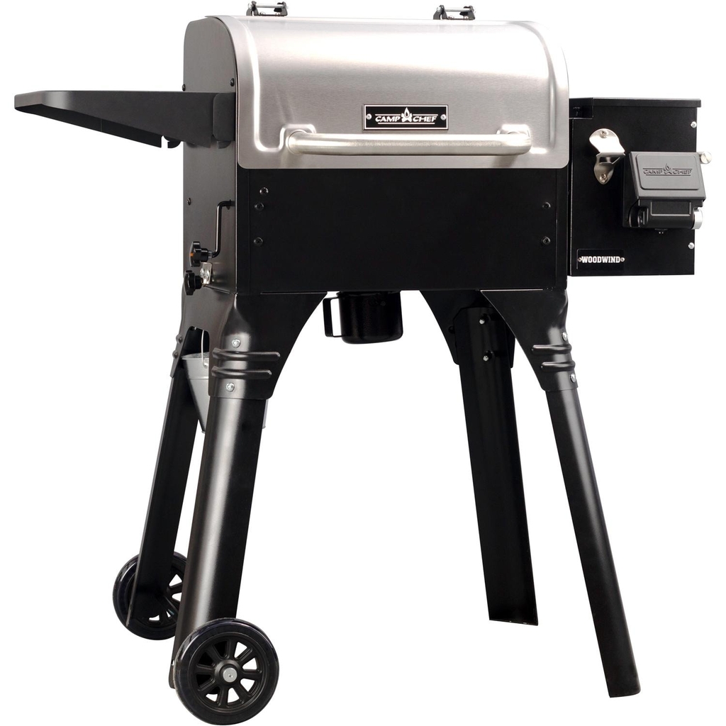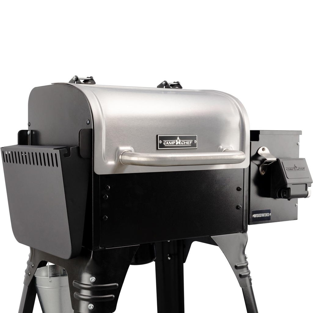 Take your grilling game to the next level with the Camp Chef Woodwind WiFi, featuring all of your favorite Woodwind series features in a compact, space-saving design, plus a full-color display, WiFi and Bluetooth-enabled PID controller that lets you control your cooks from the palm of your hand. Set temperatures, adjust smoke levels, set timers and even receive notifications when your meat reaches desired temperature using the Camp Chef Connect app on your mobile device. With the turn of a knob or tap of a finger you can set temperatures as low as 160 degrees for smoking and up to 500 degrees for the perfect sear. Smart Smoke technology keeps your Camp Chef pellet grill within 15 degrees of your selected temperature. Adjust smoke intensity just as easily with 10 levels to choose from. The PID controller also allows you to connect and monitor up to 4 meat probes and grill temperatures simultaneously, it even has a built-in cover to protect the display when not in use. The Woodwind WiFi is constructed of durable powder coated steel with a stainless steel lid and fire box. It features a 13 3/4 by 18.4 inch enameled-steel primary cooking area and a nickel plated upper rack for 506 square inches of total cooking space, all heated by up to 25,000 BTUs of cooking power. The upper rack is also height adjustable, giving you more room for taller food without having to completely remove the upper rack. The automatic auger dispenses pellets as needed from the high capacity hopper, which holds up to 10 pounds of pellets at once. The hopper even has a built-in bottle opener and a chord wrap for extra convenience. Slide and Grill technology allows you to switch between direct and indirect flame cooking with just the pull of a knob. A continuous fan insures that your grill stays evenly heated and smoky, so every bit of food is perfectly cooked. When you are done cooking, clean up is easy, thanks to the exclusive Camp Chef ash cleanout system. Simply pull open the trap door with the side knob and empty the ash cup underneath the grill. This grill also features a pair of large, heavy-duty wheels for easy rolling and maneuverability, a powder coated steel bottom shelf and a folding side shelf. Includes 4 stainless steel meat probes.
