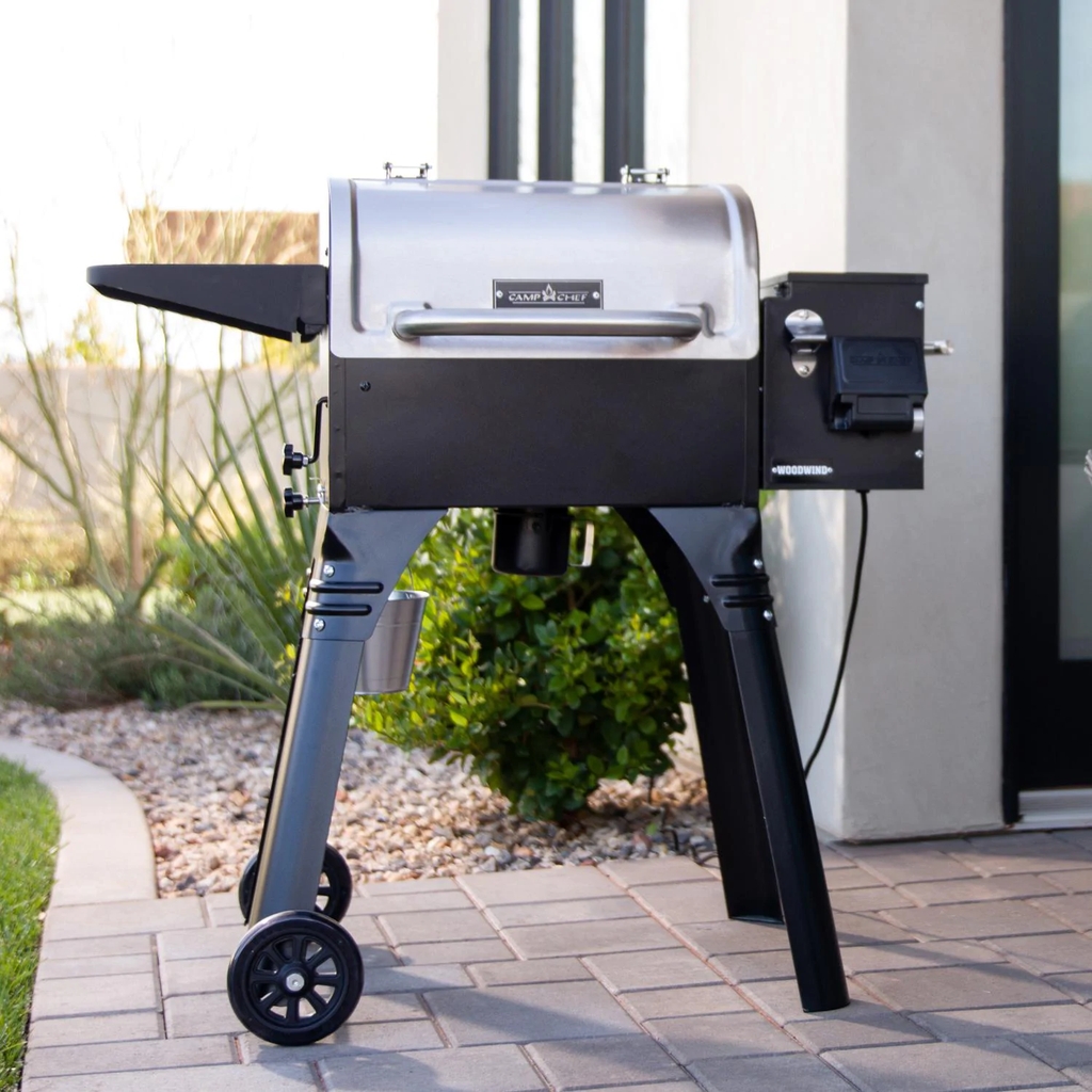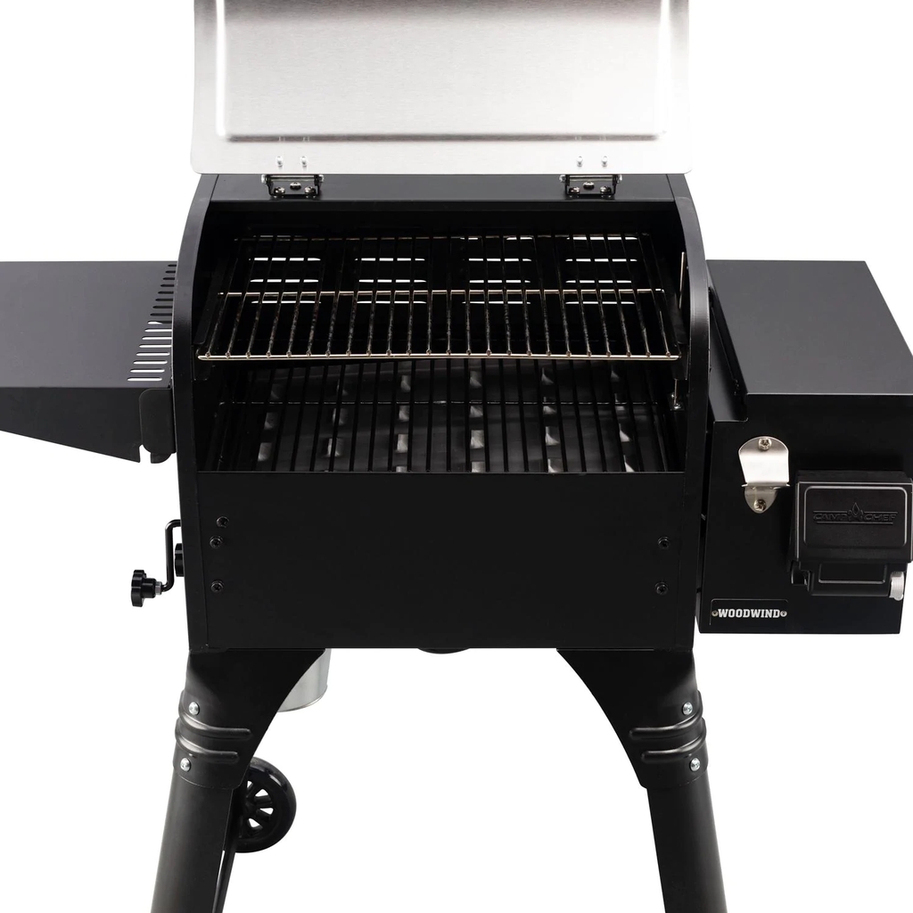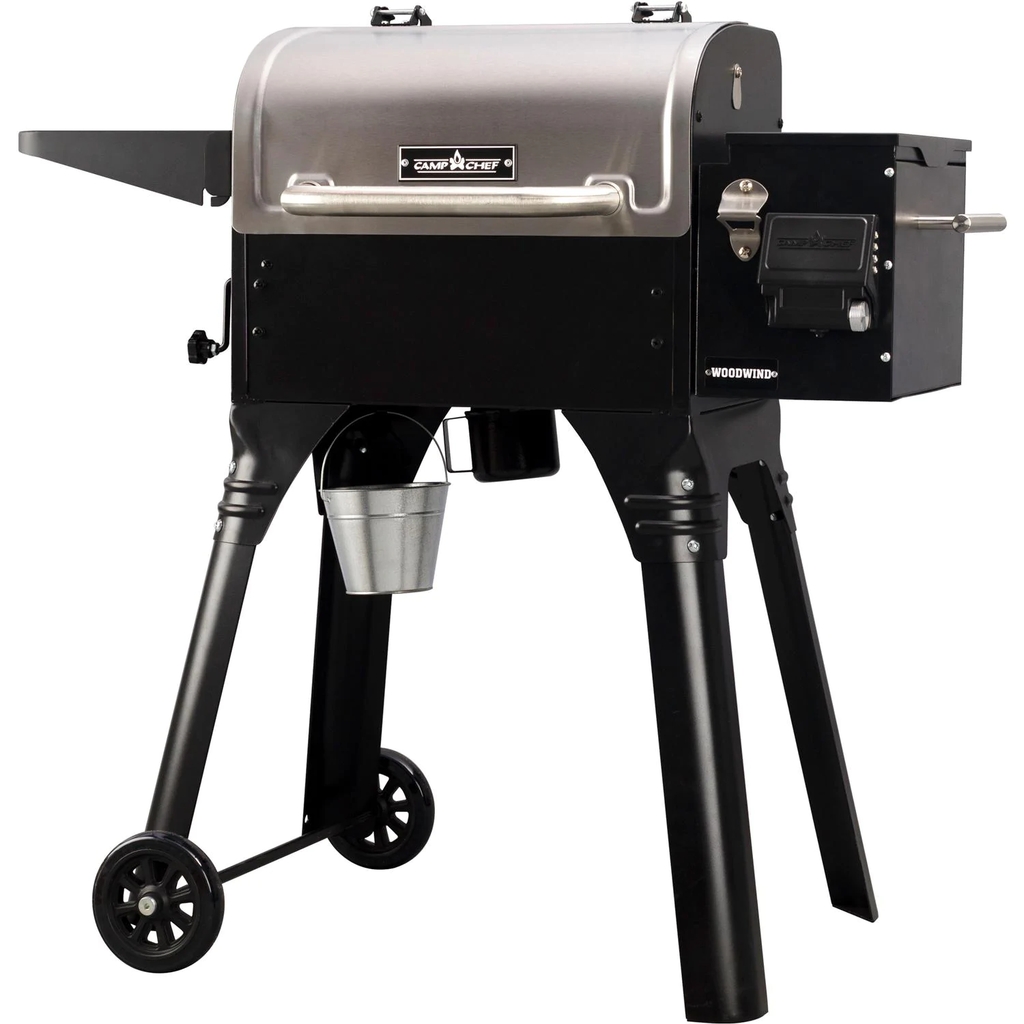 Take your grilling game to the next level with the Camp Chef Woodwind WiFi, featuring all of your favorite Woodwind series features in a compact, space-saving design, plus a full-color display, WiFi and Bluetooth-enabled PID controller that lets you control your cooks from the palm of your hand. Set temperatures, adjust smoke levels, set timers and even receive notifications when your meat reaches desired temperature using the Camp Chef Connect app on your mobile device. With the turn of a knob or tap of a finger you can set temperatures as low as 160 degrees for smoking and up to 500 degrees for the perfect sear. Smart Smoke technology keeps your Camp Chef pellet grill within 15 degrees of your selected temperature. Adjust smoke intensity just as easily with 10 levels to choose from. The PID controller also allows you to connect and monitor up to 4 meat probes and grill temperatures simultaneously, it even has a built-in cover to protect the display when not in use. The Woodwind WiFi is constructed of durable powder coated steel with a stainless steel lid and fire box. It features a 13 3/4 by 18.4 inch enameled-steel primary cooking area and a nickel plated upper rack for 506 square inches of total cooking space, all heated by up to 25,000 BTUs of cooking power. The upper rack is also height adjustable, giving you more room for taller food without having to completely remove the upper rack. The automatic auger dispenses pellets as needed from the high capacity hopper, which holds up to 10 pounds of pellets at once. The hopper even has a built-in bottle opener and a chord wrap for extra convenience. Slide and Grill technology allows you to switch between direct and indirect flame cooking with just the pull of a knob. A continuous fan insures that your grill stays evenly heated and smoky, so every bit of food is perfectly cooked. When you are done cooking, clean up is easy, thanks to the exclusive Camp Chef ash cleanout system. Simply pull open the trap door with the side knob and empty the ash cup underneath the grill. This grill also features a pair of large, heavy-duty wheels for easy rolling and maneuverability, a powder coated steel bottom shelf and a folding side shelf. Includes 4 stainless steel meat probes.