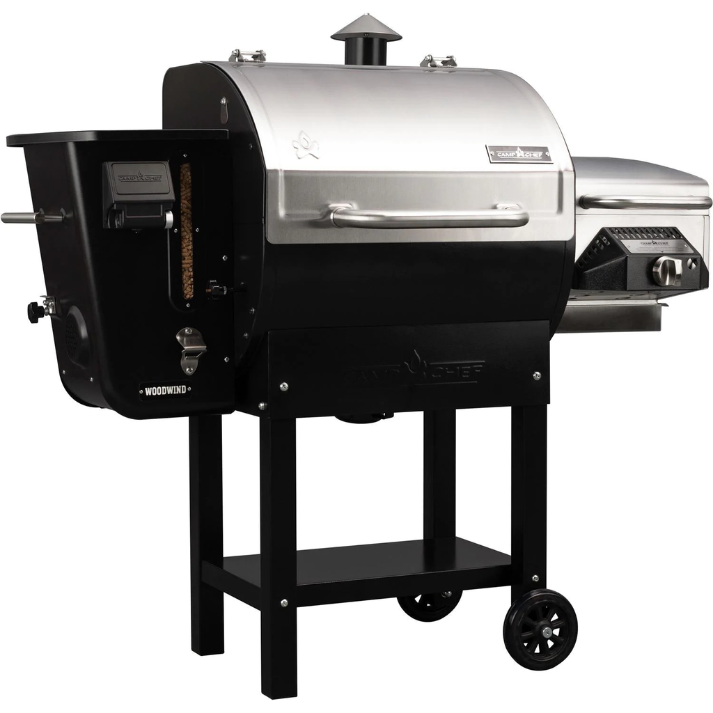 Take your grilling game to the next level with the Camp Chef Woodwind WiFi, featuring all of your favorite Woodwind series features, plus a full-color display, WiFi and Bluetooth-enabled PID controller that lets you control your cooks from the palm of your hand. Set temperatures, adjust smoke levels, set timers and even receive notifications when your meat reaches desired temperature using the Camp Chef Connect app on your mobile device. With the turn of a knob or tap of a finger you can set temperatures as low as 160 degrees for smoking and up to 500 degrees for the perfect sear. Smart Smoke technology keeps your Camp Chef pellet grill within 15 degrees of your selected temperature. Adjust smoke intensity just as easily with 10 levels to choose from. The PID controller also allows you to connect and monitor up to 4 meat probes and grill temperatures simultaneously, it even has a built-in cover to protect the display when not in use. The Woodwind WiFi is constructed of durable powder coated steel with a stainless steel lid and fire box. It features a 19 1/2 by 22 inch enameled-steel primary cooking area and a 2-piece nickel plated upper rack for 797 square inches of total cooking space, all heated by up to 25,000 BTUs of cooking power. The 2-piece upper rack is also height adjustable, giving you more room for taller food without having to completely remove the upper rack. The automatic auger dispenses pellets as needed from the high capacity hopper, which holds up to 22 pounds of pellets at once and has a viewing window and pellet purge feature for emptying or changing out pellets. The hopper even has a built-in bottle opener and a chord wrap for extra convenience. Slide and Grill technology allows you to switch between direct and indirect flame cooking with just the pull of a knob. A continuous fan insures that your grill stays evenly heated and smoky, so every bit of food is perfectly cooked. When you are done cooking, clean up is easy, thanks to the exclusive Camp Chef ash cleanout system. Simply pull open the trap door with the side knob and empty the ash cup underneath the grill. This grill also features a pair of large, heavy-duty wheels for easy rolling and maneuverability, and a powder coated steel bottom shelf. Includes 4 stainless steel meat probes. This Woodwind WiFi also includes a Sear Box, which is a stainless steel, 16,000 BTU propane side grill that can reach up to 900 degrees. The Sear Box features a 184 square inch enamel coated cast iron grate for the perfect sear and heat diffuser plates to turn the flame into infrared heat. A hose, regulator, and holding bracket are included for a 20-pound propane tank (tank not included).