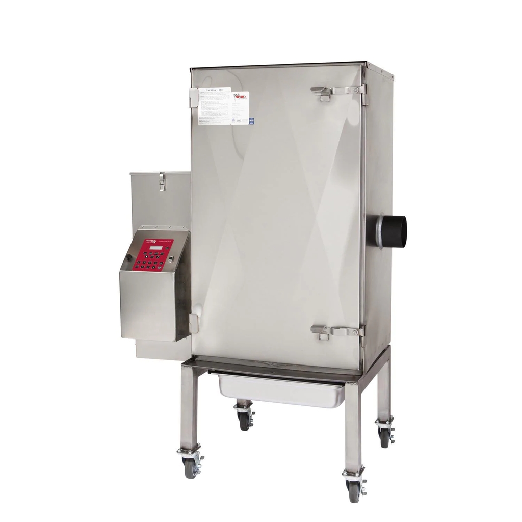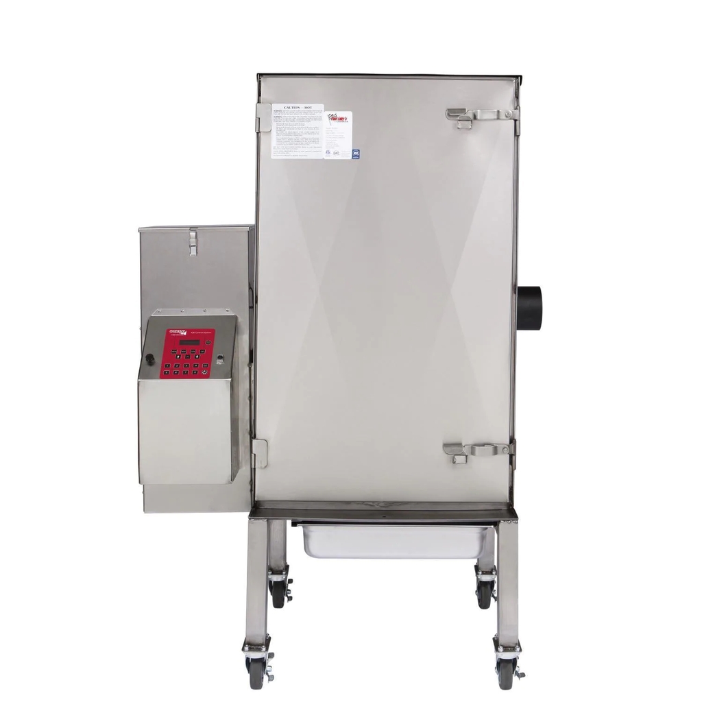 Fast Eddys by Cookshack smokers are 100 percent wood burning, pellet-fired smokers and feature stainless steel construction and 850 degree Spin-Glass insulation, keeping the internal temperatures consistent and the outside cool to the touch. The Cookshack exclusive IQ5 technology allows you to cook your meat at a temperature and time that you set. The proprietary IQ5 electronic time and temperature controller is easy to use and gives you consistent results with every use. This Fast Eddys by Cookshack smoker has a temperature range of 130 to 400 degrees Fahrenheit. It features 3-stage or 2-stage cooking modes, meat probe mode, USB data port, and 8 programmable presets. When the smoke cycle has finished, the controller drops automatically to the hold temperature. Thermostatically controlled temperature eliminates large heat fluctuations that dry and shrink meat. Patented automatic wood pellet stoker-fed system is operated by the IQ5 controller. It knows when the smoker needs more fuel; you can go away and leave it to do its job without your attention. The hopper has a 20 pound capacity and the smoker can cook for over 24 hours on one load of pellets. Easy, flip-of-the switch start brings the smoker rapidly up to smoking temperature. Burners stay on when doors are opened and heat recovery occurs in as little as 10 minutes while other brand smokers take up to an hour to bring the temperature back up. Includes four 23 X 17-inch nickel plated steel racks that are removable and can be power washed for quick clean up. This smoker comes ready to use with casters, operators manual, 40 lbs of wood pellets, cookbook, and a Cookshack spice kit containing: 1 gal. Spicy Barbecue Sauce, 1 gal. Mild Barbecue Sauce, 5 lbs. Brisket Rub, 5 lbs. Rib Rub, 5 lbs. Spicy Chicken Rub, 10 oz. Chili Mix, and 10 oz. Spicy Barbecue Sauce Mix. All Cookshack smokers and pellet grills are proudly made in the USA.