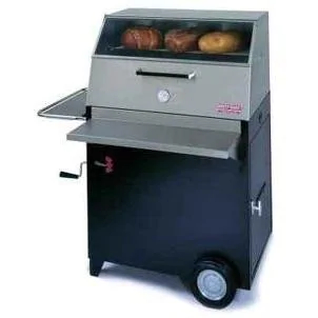 This Hasty-Bake Gourmet Dual Finish Charcoal Grill is Hasty-Bakes ultimate charcoal oven. The Dual Finish Gourmet features an 18 gauge powder coated base with a 20 gauge stainless steel hood and 3/16 inch thick tempered glass window; 834 sq inches of total cooking surface (523 primary); an adjustable charcoal tray; stainless steel front and side tables; 28. 5 x 10. 75 inch removable warming rack; and a door on side for easy charcoal access and cleaning. Hood is designed with a bifold door and rotisserie cooking in mind. The hood will even allow the serious backyard chef the opportunity to run two rotisseries at one time. 5 year warranty. Grill Dimensions (in inches): 41 1/2 W x 21 D x 47 H.