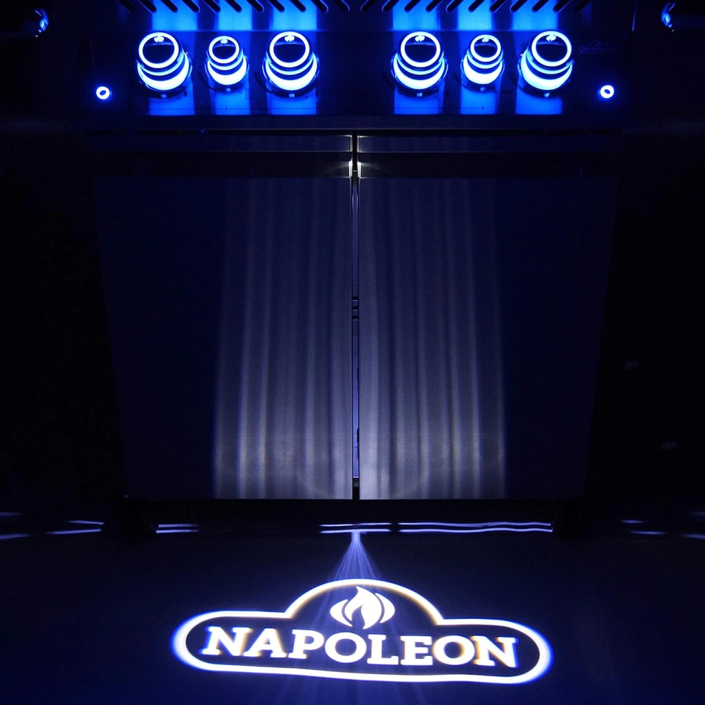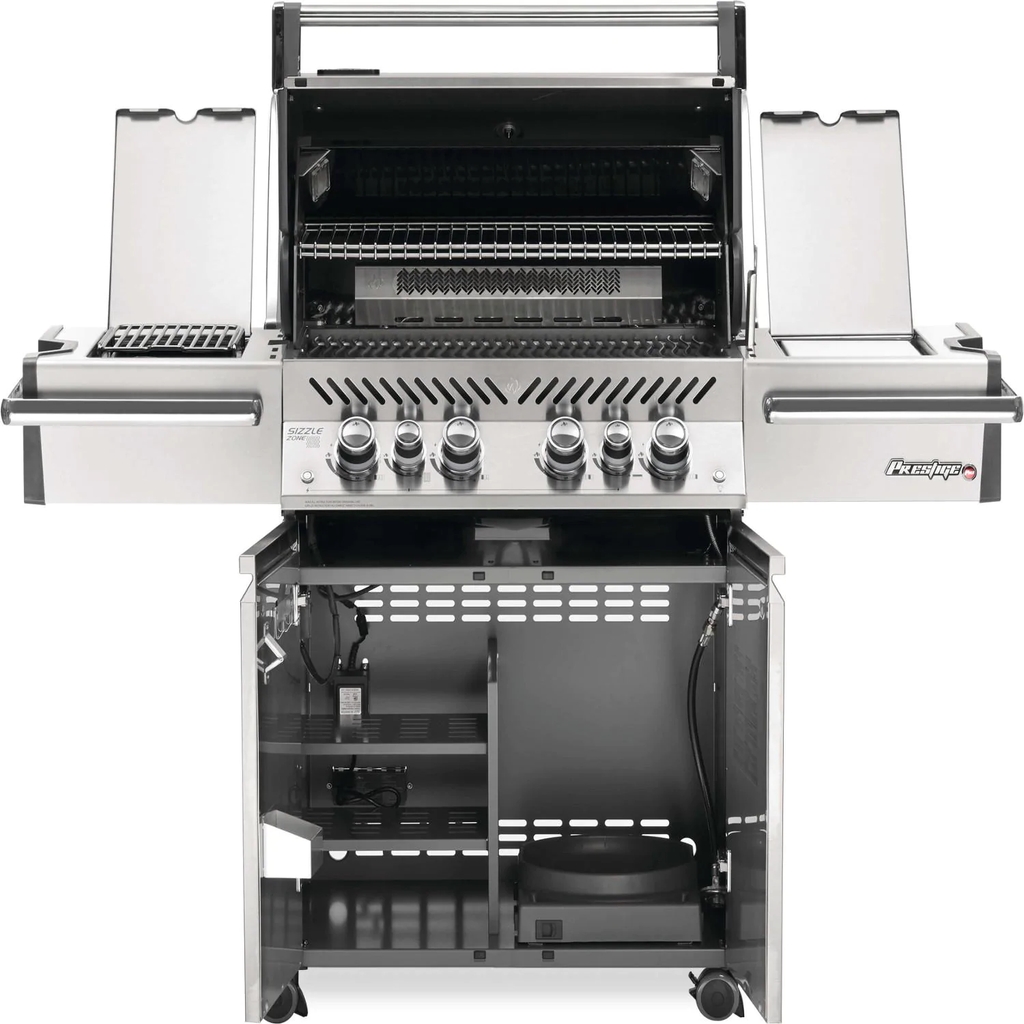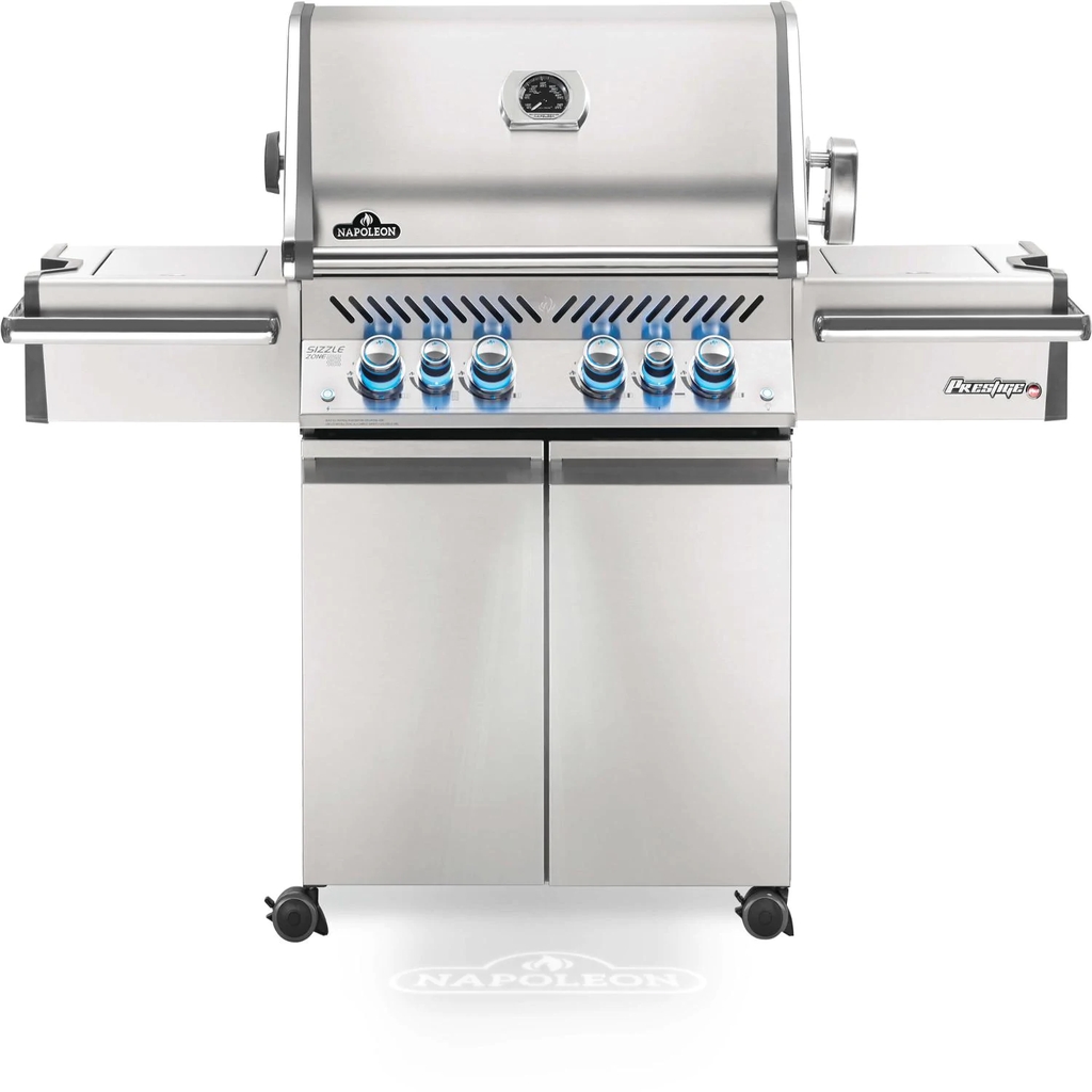The Napoleon Prestige PRO 500 blends quality and performance into one package, and has the features to make every cooking experience exceptional. This freestanding propane gas grill has four stainless steel tube burners that provide up to 48,000 BTUs of cooking power. The grill has stainless steel cooking grates with 500 square inches of main cooking area and 400 square inches across the stainless steel warming area for a total of 900 square inches of cooking area. Easily turn the burners on with flame ignition for a reliable start up. The stainless steel wave cooking grids create the trademark Napoleon sear lines. The stainless steel, self-cleaning sear plates vaporize drippings, control flare ups and keep your food moist. The Prestige PRO 500 also has a 18,000 BTU stainless steel rear infrared burner for slow cooking with the rotisserie kit and a 14,000 BTU infrared side burner for searing meats. The hood features an Accu-Probe temperature gauge, stainless steel end caps and retains heat for oven-like performance. The LED Spectrum Night Light control knobs have near limitless color options making your night time entertaining a breeze, and they glow red when a burner is in use while two interior lights illuminate the grilling surface. A full width drip pan also makes clean up a breeze. The stainless steel grill cart also features a built-in ice bucket and double doors with soft close for storage and easy roll locking casters for moving the grill around. This Napoleon grill is manufactured in Canada.