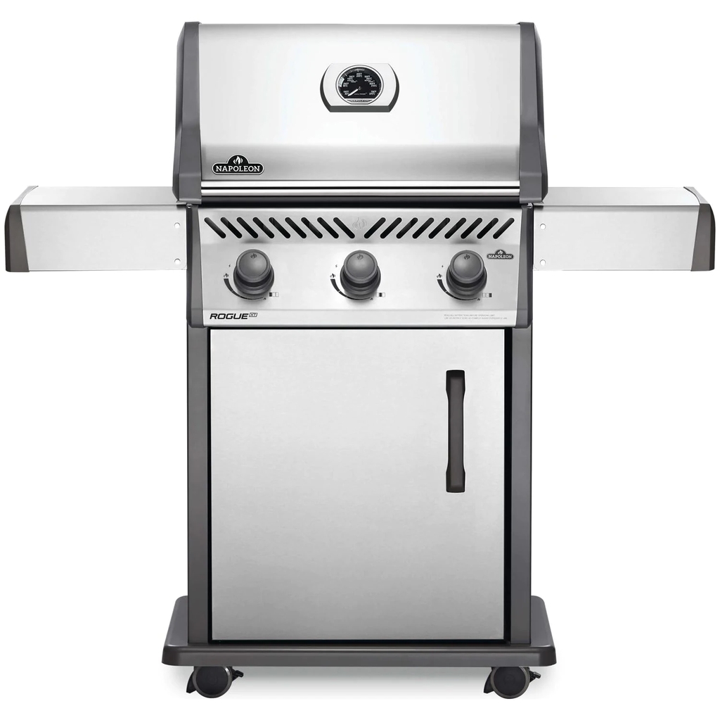 The Napoleon Rogue XT 425 propane gas grill boasts three stainless steel tube burners that provide up to 42,000 BTUs of cooking power. Between the main grilling area, and large warming rack, the Napoleon Rouge XT 425 features a total of 570 square inches of cooking area, providing plenty of room to cook your favorite foods. The Napoleon Jetfire ignition ensures a controlled flame and a quick and easy start up every time. Dual level stainless steel sear plates vaporize drippings, provide even heat distribution, and help keep your food moist. The high top stainless steel lid provides extra cooking space, retains heat for oven-like performance, and features an Accu-Probe temperature gauge for measuring the precise internal temperature of your grill. Reversible porcelain coated cast iron wave cooking grids deliver those famous Napoleon sear lines. The durable powder coated grill cart features a stainless steel access door, folding side shelves with integrated tool hooks, built-in propane tank storage, and Easy Roll locking casters for moving the grill around. This Napoleon Rogue grill is manufactured in Canada.