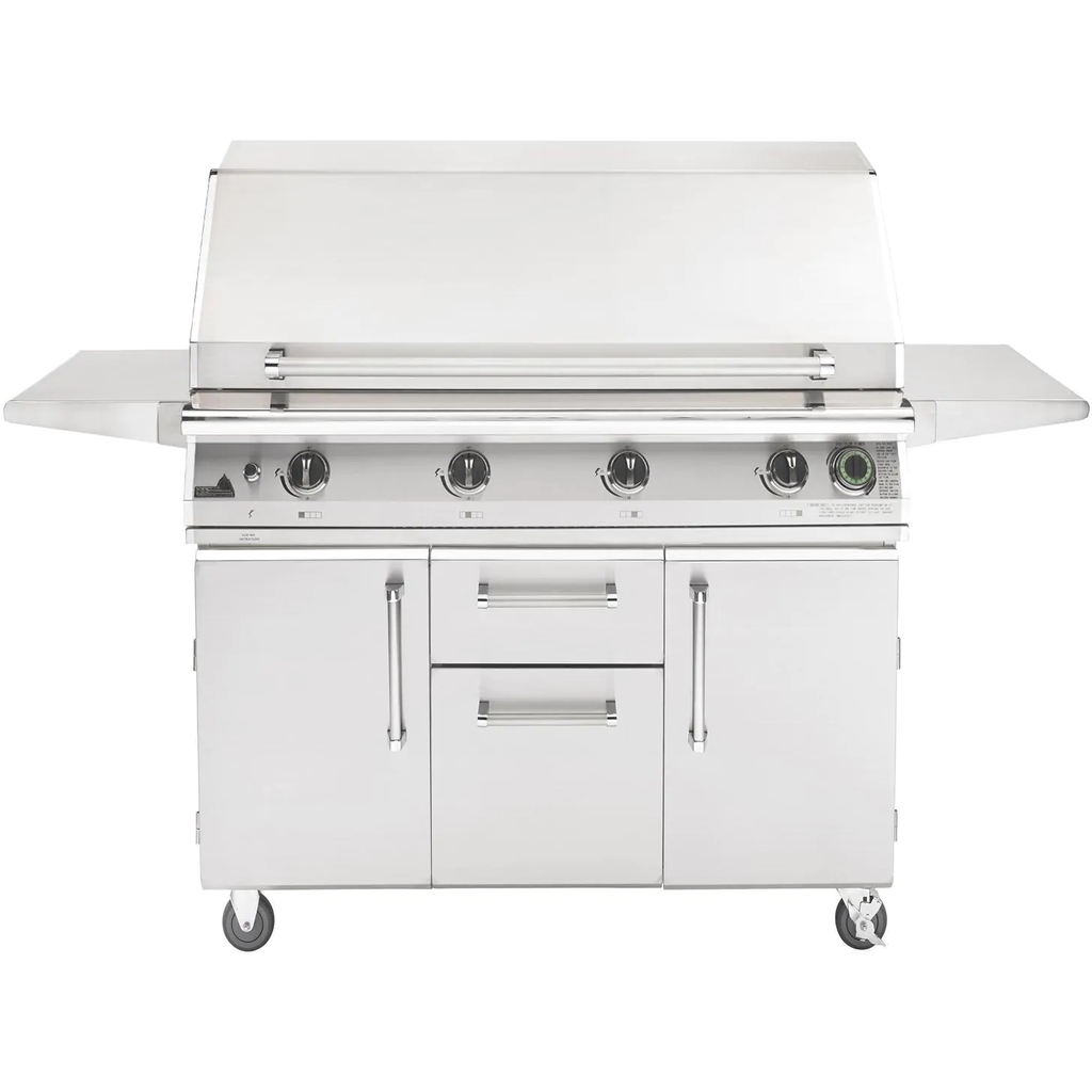 Designed to withstand the rigors of daily use in commercial settings such as apartments, condos and resorts, the PGS T-series is engineered with strong, durable materials while featuring a simple design that is easy to use. This PGS 51-inch built-in natural gas grill boasts a 304 grade stainless steel exterior and four heavy-duty stainless steel burners that push 102,000 BTUs of total cooking power on the grilling surface. The new, heavy duty, 16 gauge 304 stainless steel flip baffle grates offer even heat and perfect smoke control with low maintenance and no ceramic briquettes to replace or maintain. The 5/16 inch stainless steel rod cooking grids with Vari Grid spacing offer cooking versatility across 960 square inches of main cooking area. The battery powered, continuous spark electronic ignition means that lighting your PGS grill is quick, easy, and safe. The control panel features laser-etched instructions, anti-theft control knobs and a built-in one hour FuelStop gas flow timer. The PGS Gas Grill cart features all stainless steel construction, double access doors, two access drawers, pull out propane holder, four swivel casters, and two fold down side shelves. ETL/INTERTEK Approved.