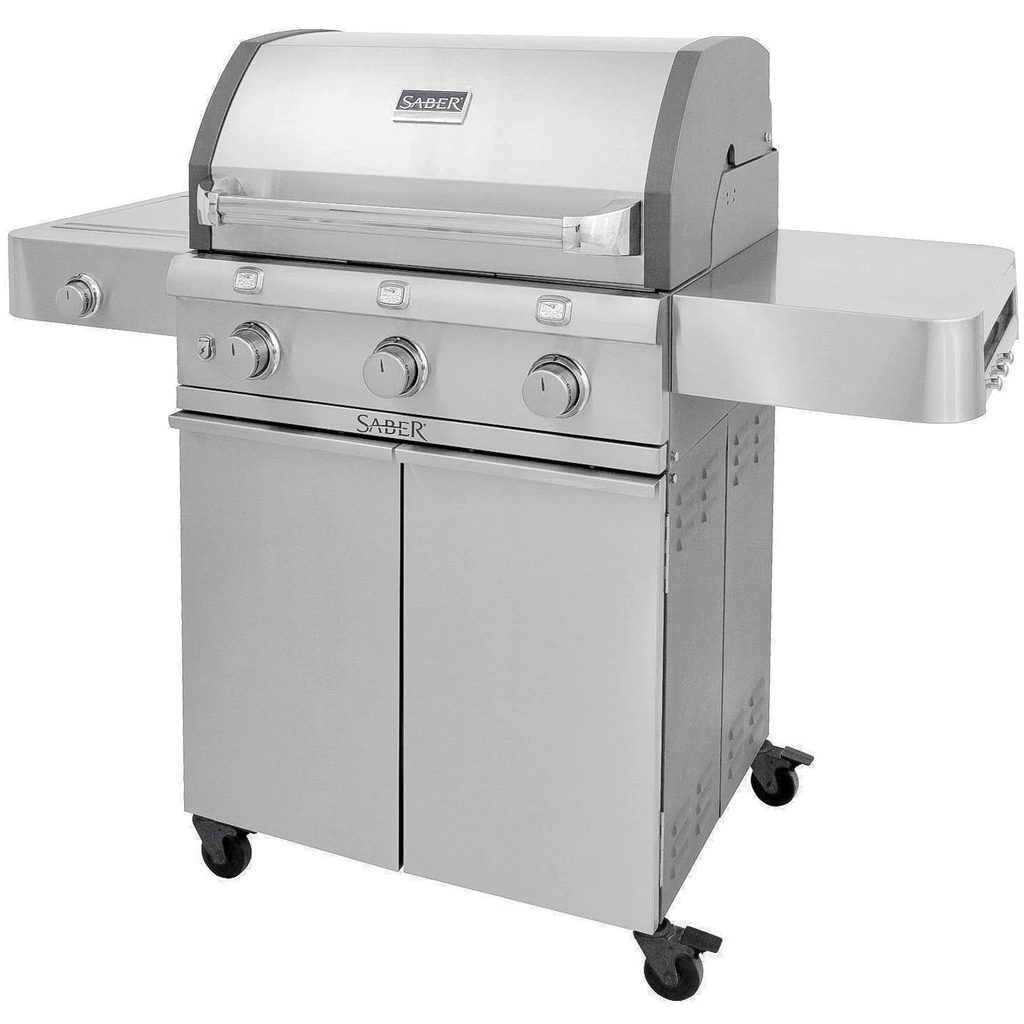 Grill with confidence at any level and enjoy professional grade results with SABER gas grills. The patented SABER infrared cooking system allows you to cook up juicier and more flavorful meals than traditional systems that use dry convection air. The unique SABER cooking grates and infrared emitters prevent flare-ups and direct airflow away from the cooking surface, providing evenly distributed, indirect heat for maximum moisture retention while grilling. The cooking grates also catch any drippings and debris, protecting the burners and creating that familiar BBQ sizzle as foods are infused with more juicy flavor. Designed with fuel efficiency in mind, the SABER infrared cooking system delivers quality results faster than most gas grills while consuming 30-percent less fuel. The burners, emitters and grates are made of 304 commercial grade stainless steel, ensuring long-lasting performance in your outdoor kitchen. The SABER Cast 500 32-inch gas grill features a 304-grade stainless steel lid with heavy-duty cast-aluminum end caps. Three 8,000 BTU gas burners, provide evenly-distributed heat across a 500 square-inch cooking surface. An adjustable, enamel-coated warming rack folds down to keep foods warm and can be folded away for additional space when using a rotisserie kit with the integrated rod holders (rotisserie kit sold separately). Precisely manage grilling temperatures across three cooking zones using individual burner control knobs, ensuring reliable start-up with integrated push-button electronic ignition. Three grate-level temperature gauges allow you to easily monitor grilling temperatures, even while the lid is lifted. Two 304-grade stainless steel side shelves provide convenient workspace with die-cast BBQ tool holders and a towel bar, as well as a 10,000 BTU side-burner in the left shelf for preparing sides and sauces while you grill. Cleaning your SABER grill after meals is easy thanks to the porcelain-coated burner boxes, firebox liners and front-access grease tray, simply burn off and brush away any remaining debris with the included grate scraper. The SABER EZ assembly cart features fully-enclosed, powder-coated storage space with stainless steel access doors and has heavy-duty, nylon locking casters for easy placement.