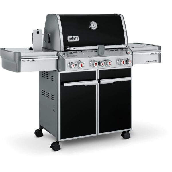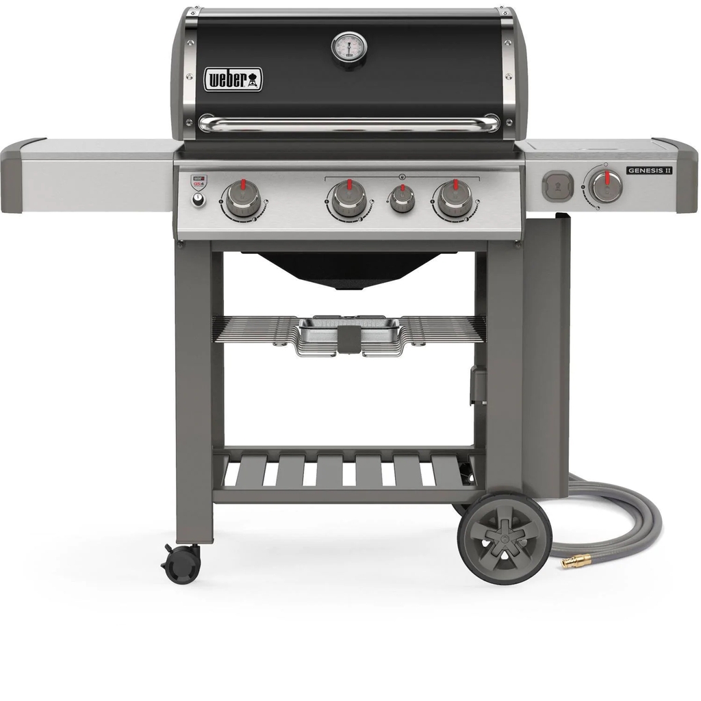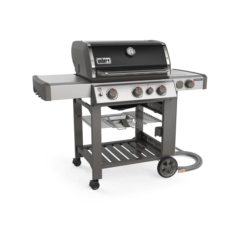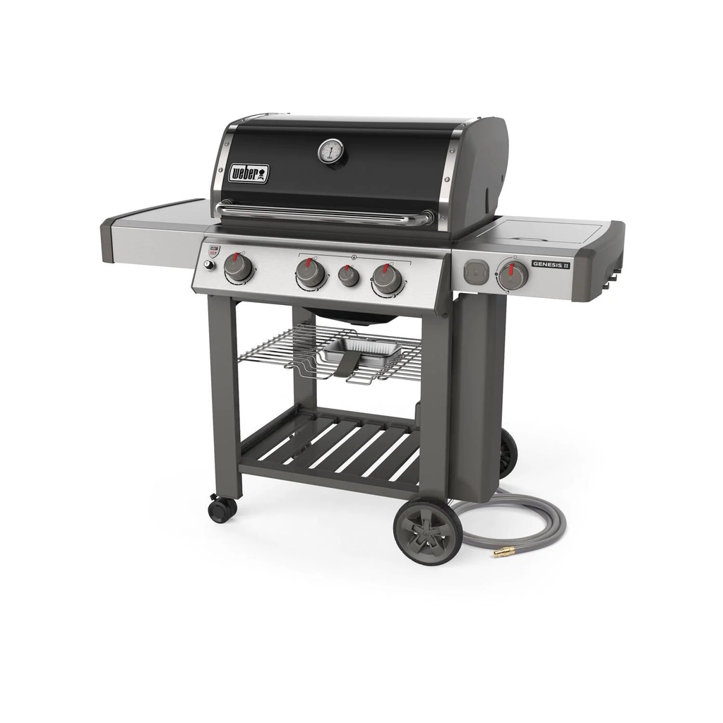 The 2019 Weber Genesis II gas grill raises the standard in backyard grilling with the GS4 high-performance grilling system, featuring continuous-spark Infinity ignition, revolutionary stainless steel high performance burners, stainless steel Flavorizer bars with flame view window and a Grease Management System. The porcelain-enameled Weber Genesis II E-330 features three stainless steel high-performance burners that produce 39,000 BTUs of power, a 12,000 BTU side shelf mounted side burner and a 9,000 BTU sear station burner. The Genesis II E series gas grills come fully equipped with porcelain-enameled cast iron cooking grates, stainless steel Flavorizer bars and stainless steel heat deflectors to effectively hold and distribute heat evenly over the 513 square-inches of cooking grates. The Tuck-Away warming rack provides an additional 156 square-inches for a generous 669 square-inches of total cooking area. The Genesis II grills come equipped with a Grease Management System that makes clean-up as easy as possible. The black color finish porcelain-enameled hood has a center-mounted thermometer to monitor cooking temperatures and has painted cast-aluminum end caps.This Genesis II E series natural gas grill is iGrill 3 ready and includes a 10-foot flexible natural gas hose. The welded tube frame, open cart design includes two shelves below the control panel and two side shelves, providing much needed prep space and two heavy-duty locking casters and two large wheels. Six convenient built-in tool hooks keep your BBQ tools nearby.