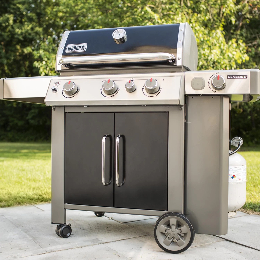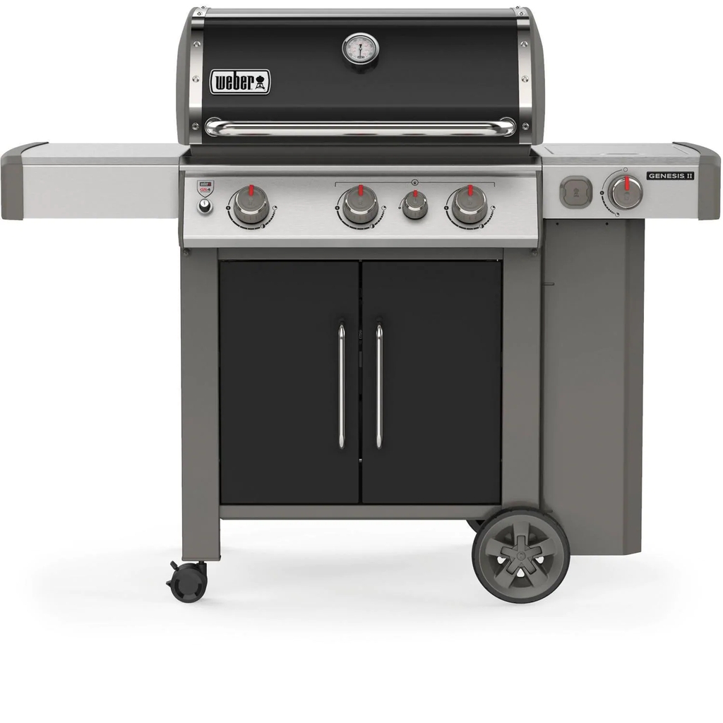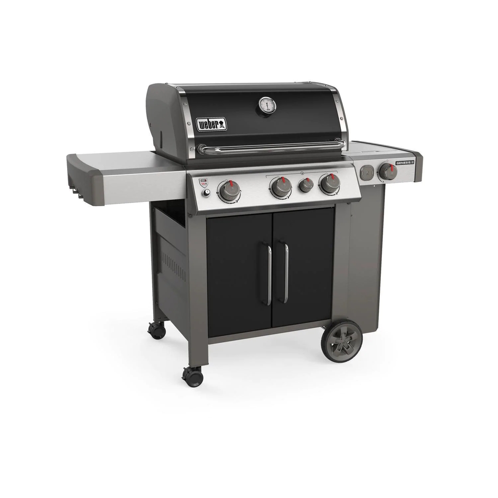 The 2019 Weber Genesis II gas grill raises the standard in backyard grilling with the GS4 high-performance grilling system, featuring continuous-spark Infinity ignition, revolutionary stainless steel high performance burners, stainless steel Flavorizer bars with flame view window and a Grease Management System. The porcelain-enameled Weber Genesis II E-335 features three stainless steel high-performance burners that produce 39,000 BTUs of power, a 12,000 BTU side shelf mounted side burner and a 9,000 BTU sear station burner. The Genesis II E series gas grills come fully equipped with porcelain-enameled cast iron cooking grates, stainless steel Flavorizer bars and stainless steel heat deflectors to effectively hold and distribute heat evenly over the 513 square-inches of cooking grates. The Tuck-Away warming rack provides an additional 156 square-inches for a generous 669 square-inches of total cooking area. The Genesis II grills come equipped with a Grease Management System that makes clean-up as easy as possible. The black color finish porcelain-enameled hood has a center-mounted thermometer to monitor cooking temperatures and has painted cast-aluminum end caps. The Genesis II E series grills are iGrill 3 ready and feature a fuel gauge on propane gas models. The welded tube frame, closed cart design with painted steel doors includes two shelves below the control panel and two side shelves, providing much needed prep space and two heavy-duty locking casters and two large wheels. The propane tank is stored to the side, freeing up the shelf space under the grill and has a tank shield that keeps the tank out of view. Six convenient built-in tool hooks keep your BBQ tools nearby.