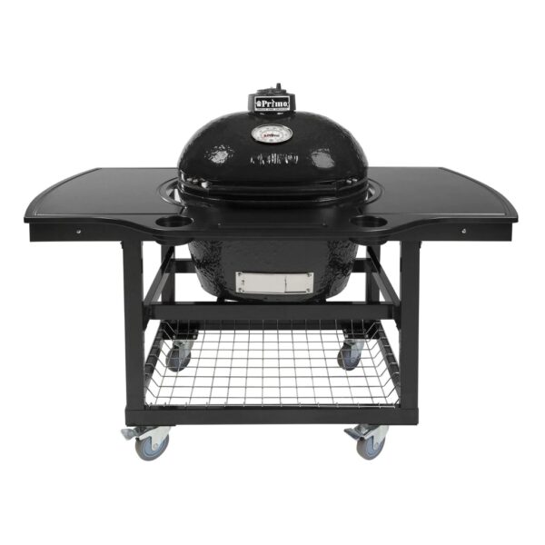 Primo Oval Large 300 Ceramic Kamado Grill On Steel Cart With 1-Piece Island Side Shelves, Cup Holders, And Stainless Steel Grates – 775